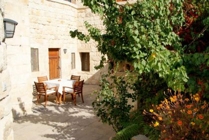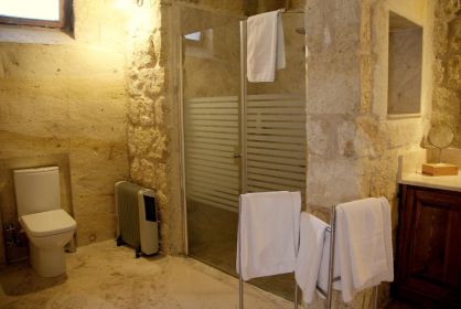 This street-level house has two bedrooms: One has beautiful stone lancet arches of tawny stone; the other is carved right from the rock—a real cave. Both have king beds and all comforts. An extra sofa bed is possible into one of the bedrooms. The cave bathroom is fully modern, with a wide vanity and walk-in shower. When it’s time for sun, sit in the spacious courtyard for coffee, meals or cocktails. The kitchen is fully equipped for cooking meals.